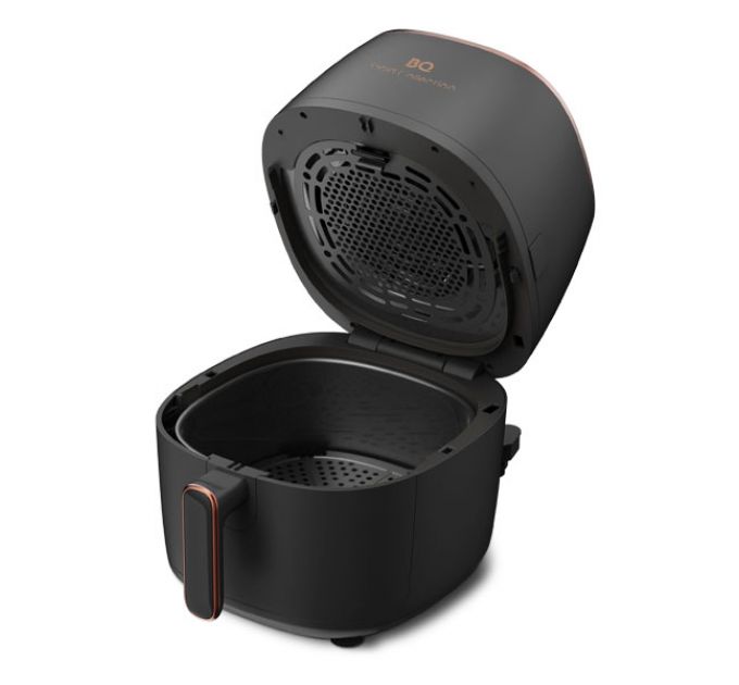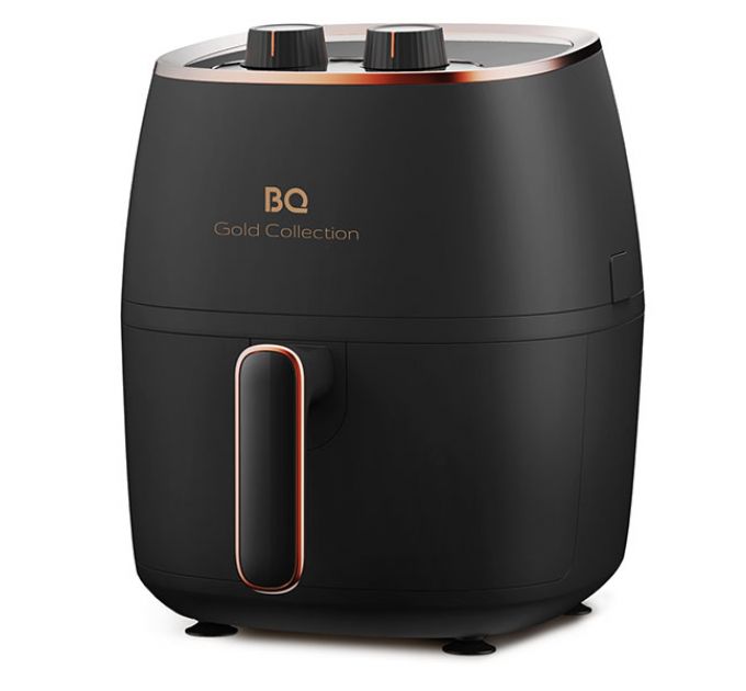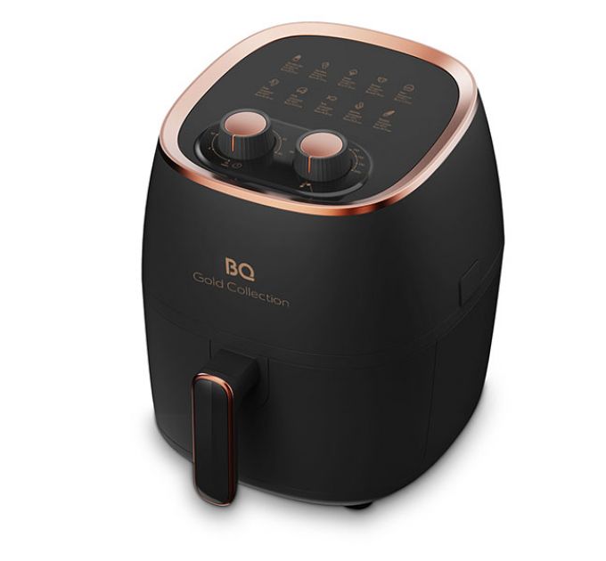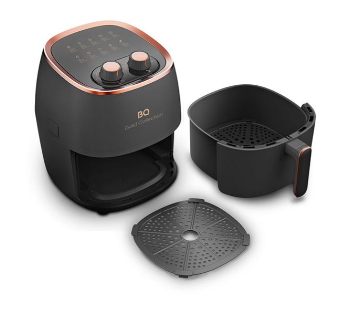 - Стильный дизайн. Черный корпус с розовыми золотыми вставками придают аэрогрилю BQ GR2000 современный и элегантный вид.